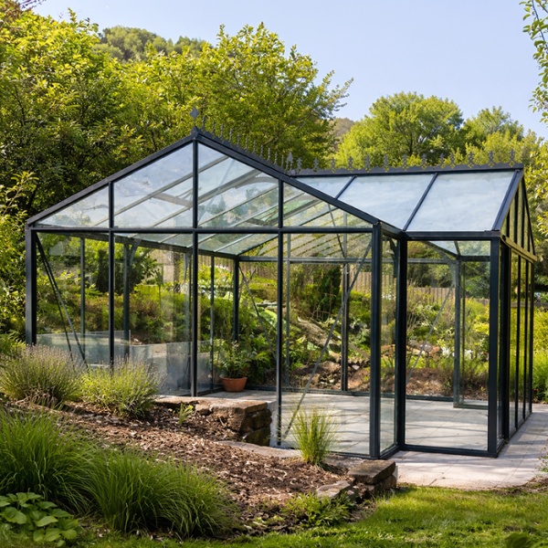 Grâce à sa forme en T, cette serre crée naturellement deux zones distinctes : l’une pour les plantes, l’autre pour le confort. Vous pouvez y installer des fauteuils, une table ou même un coin bureau.